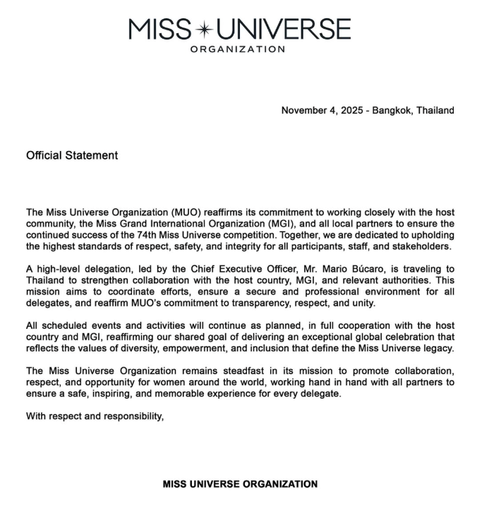 La tabasqueña Fátima Bosch, Miss Universe México 2025, confirmó que no abandonará el certamen internacional pese al conflicto con Nawat Itsaragrisil, directivo del concurso, quien la insultó públicamente durante un evento en Tailandia. Con temple y serenidad, Bosch declaró: “No tengo miedo, tengo un propósito”, dejando claro que su participación va más allá de una corona o del espectáculo.