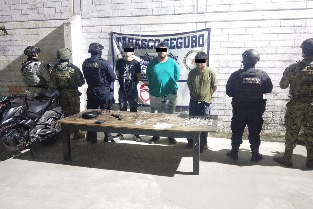 Tres presuntos integrantes de una célula delictiva dedicada a la venta de drogas fueron detenidos en Villa Chichicapa, durante un operativo conjunto realizado por la Armada de México y la Fuerza Interinstitucional de Reacción Táctica “Olmeca Tiburón” (FIRT).