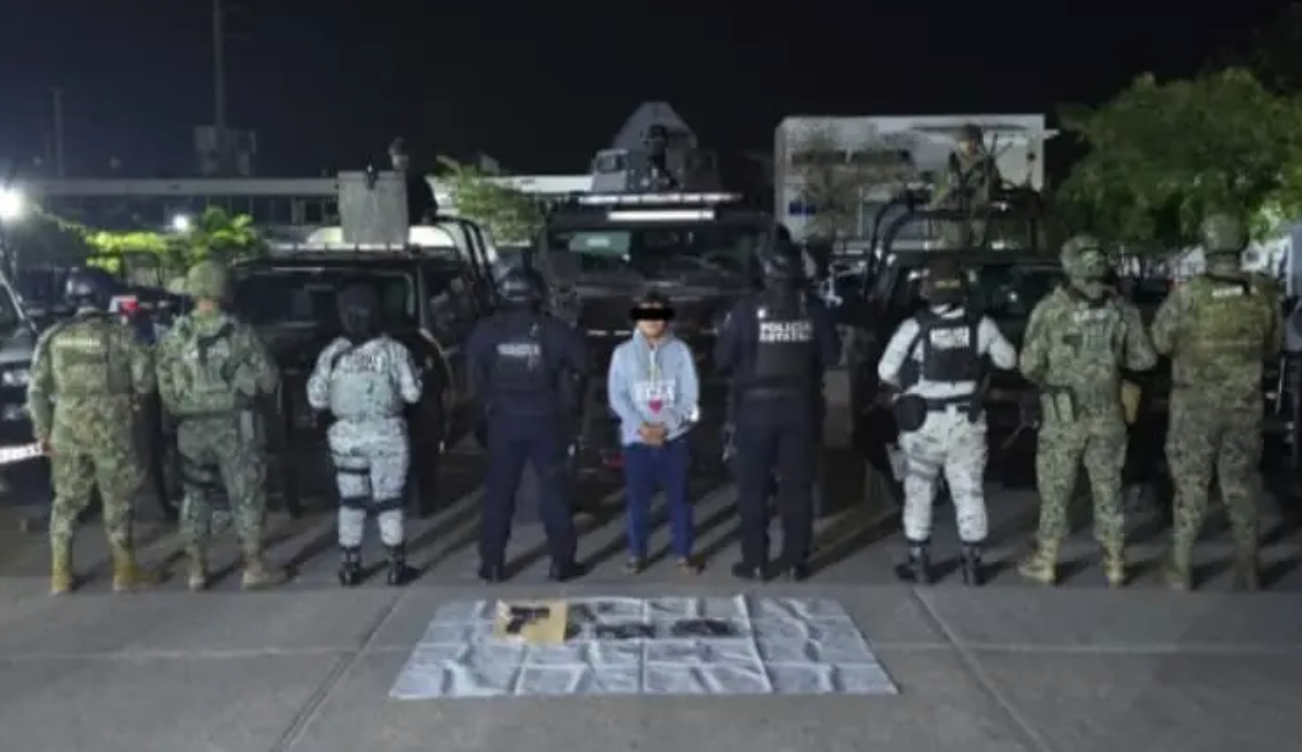 Además, se decomisó numerario en efectivo y una mariconera color café. El detenido y los objetos asegurados fueron puestos a disposición de la autoridad competente, que será la encargada de continuar las investigaciones y determinar su situación jurídica conforme a la ley.