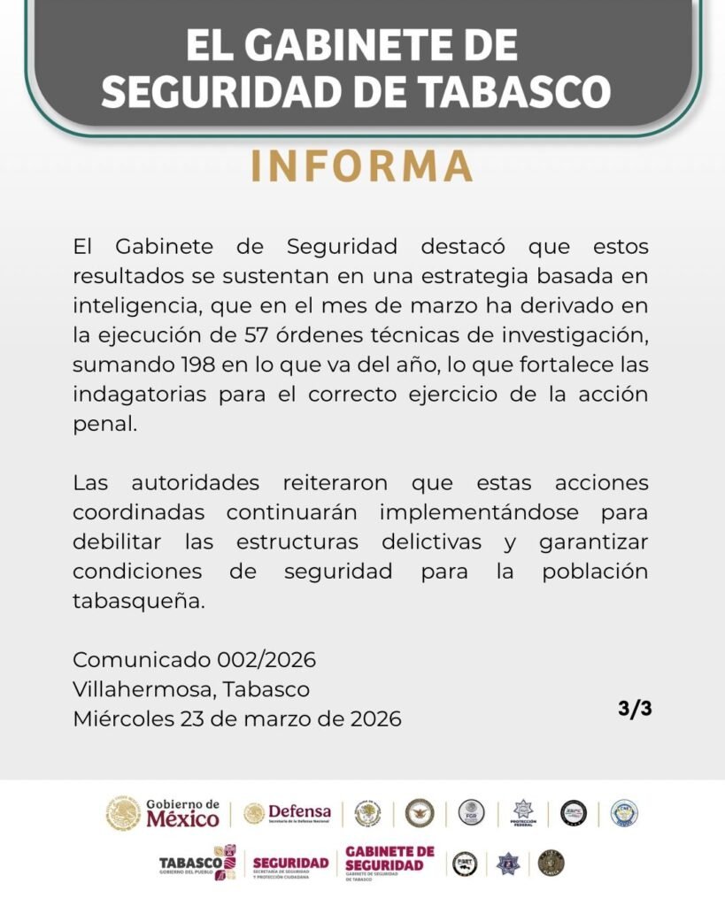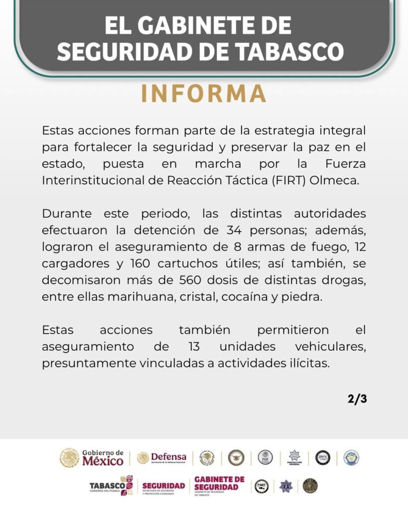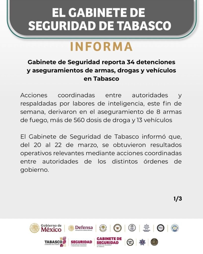El Gabinete de Seguridad de Tabasco reportó resultados relevantes tras operativos realizados del 20 al 22 de marzo, con la detención de 34 personas y el aseguramiento de armas, drogas y vehículos presuntamente vinculados a actividades ilícitas.