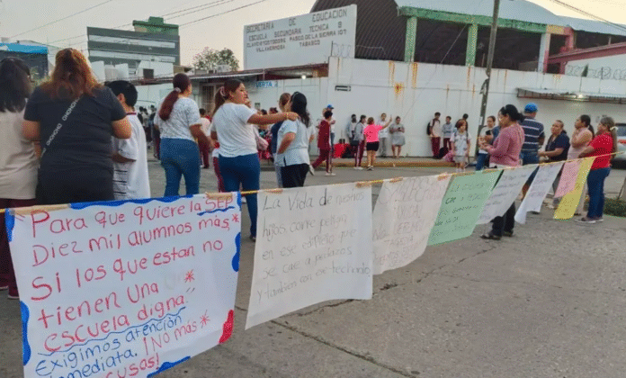 La mañana de este jueves, padres de familia de la Escuela Secundaria Técnica No. 9 bloquearon Paseo de la Sierra para exigir la reconstrucción de un edificio con severos daños estructurales, problemática que, aseguran, han denunciado desde 2023 sin obtener respuesta. De acuerdo con los manifestantes, el Instituto de Protección Civil del Estado de Tabasco recomendó acordonar zonas del plantel debido al riesgo por desprendimiento de escombro.