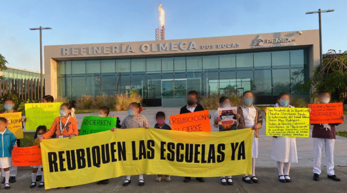 Padres de familia de la escuela primaria Abias Domínguez y del jardín de niños Agustín Melgar realizaron una protesta frente a la Refinería Olmeca, en el municipio de Paraíso, para solicitar la reubicación de ambos planteles educativos. La manifestación se llevó a cabo durante la mañana de este lunes, cuando los inconformes se plantaron en uno de los accesos principales de la refinería.