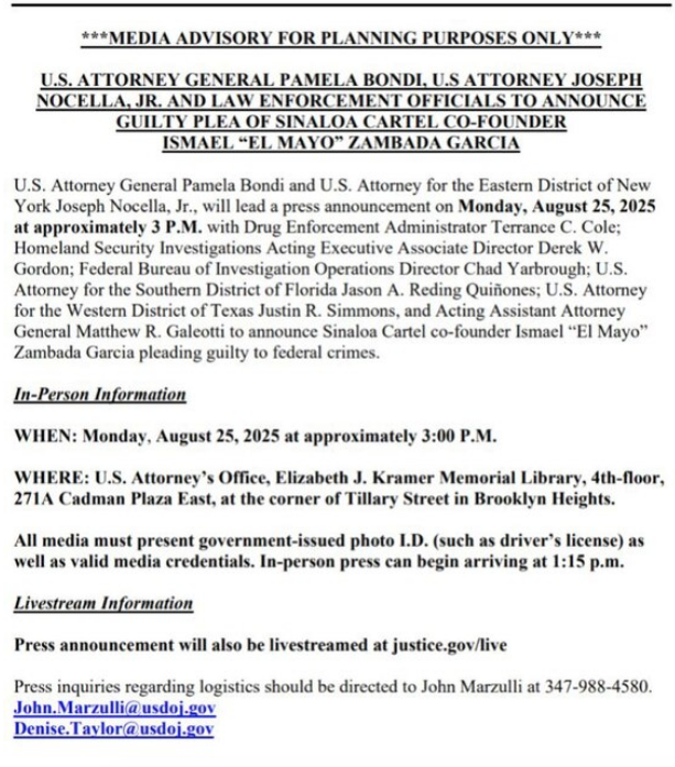 Ismael “El Mayo” Zambada, líder histórico del Cártel de Sinaloa, se declaró culpable en una corte federal de Brooklyn por narcotráfico, delincuencia organizada y lavado de dinero. La fiscal general de Estados Unidos, Pamela Bondi, encabezó la conferencia en la que aseguró que será tratado como “narcotraficante terrorista internacional” y advirtió que “morirá en prisión por los crímenes cometidos”. Zambada enfrenta 17 cargos y la confiscación de 15 mil millones de dólares. El fiscal del Distrito Este de Nueva York y el jefe de la DEA coincidieron en que este caso demuestra que nadie está fuera del alcance de la justicia estadounidense. Capturado en julio de 2024 en Nuevo México junto a Joaquín Guzmán López, su arresto fracturó al Cártel de Sinaloa, generando violencia interna. El caso marca un precedente histórico en la lucha contra el crimen organizado internacional.
