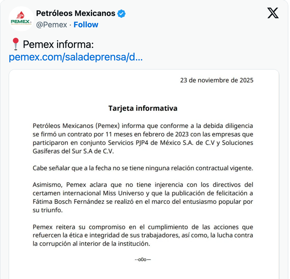 El comunicado fue realizado en respuesta a las acusaciones que circularon en redes y medios sobre presunta influencia en el resultado de Miss Universo. Pemex remarcó que opera bajo principios de transparencia. El tema generó opiniones encontradas, entre quienes defienden la legitimidad de Bosch y quienes cuestionan el resultado. Así, la empresa busca marcar distancia ante un tema sensible que involucra reputación institucional, mientras la opinión pública sigue debatiendo sobre el proceso y la transparencia de Miss Universo 2025.