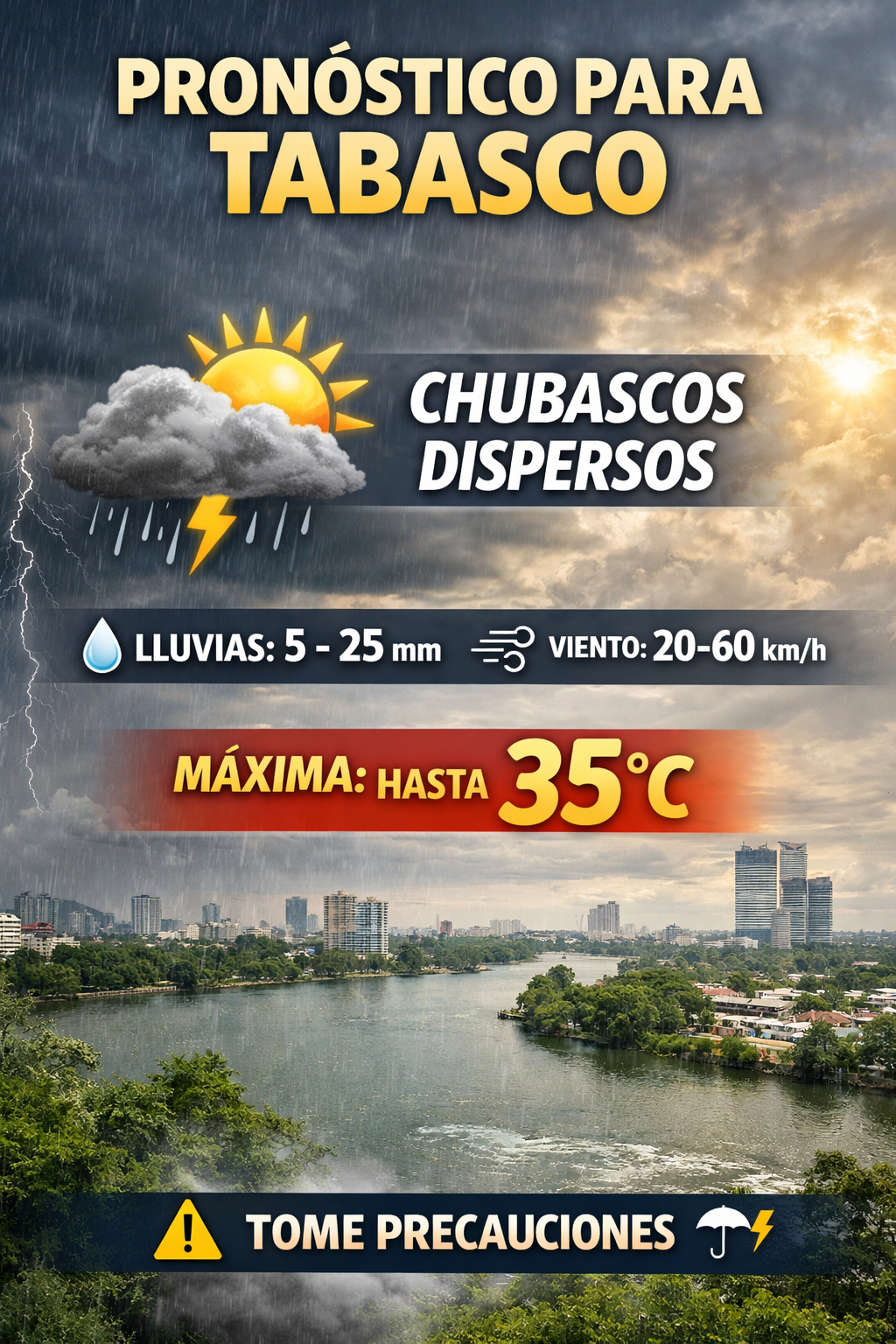 En cuanto a las temperaturas, el pronóstico indica que las máximas oscilarán entre 30 y 35 grados Celsius, manteniendo un ambiente cálido durante el día en gran parte del territorio tabasqueño.