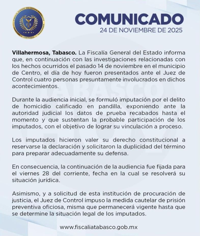La Fiscalía General del Estado presentó ante el Juez de Control a cuatro personas señaladas por su presunta participación en los hechos del 14 de noviembre en el municipio de Centro, relacionados con el homicidio de Rodrigo N. Durante la audiencia inicial, la autoridad ministerial expuso datos de prueba que respaldan la probable responsabilidad de los imputados, quienes enfrentan la acusación de homicidio calificado en pandilla.