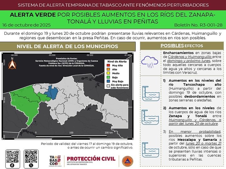 Entre los ríos con riesgo de aumento destacan el Tancochapa, que podría desbordarse en su parte alta; el Zanapa y el Tonalá, con incrementos previstos a partir del lunes; y los Mezcalapa y Samaría, cuya elevación dependerá de las lluvias en cuencas tributarias.