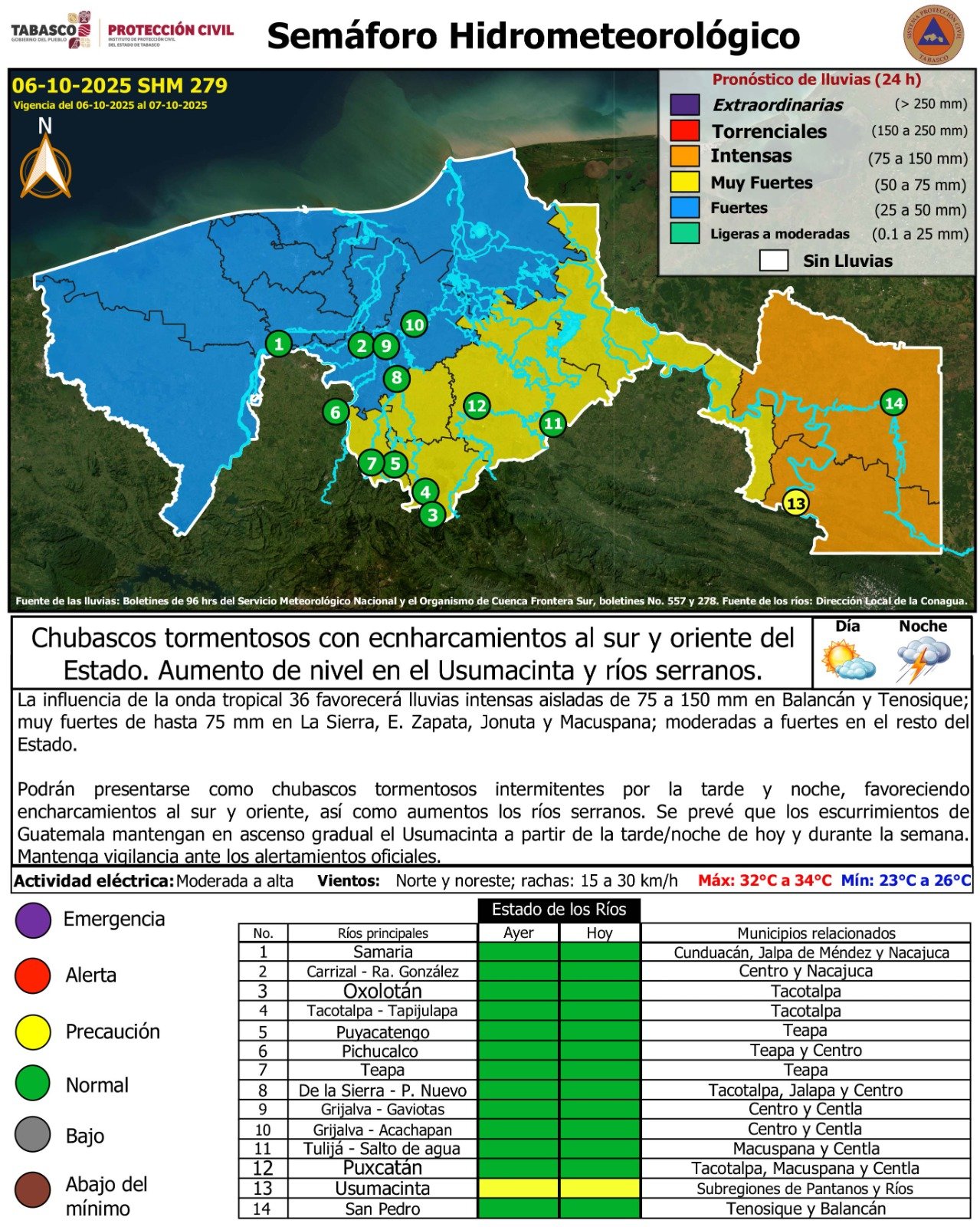 El Instituto de Protección Civil del Estado de Tabasco informó que la onda tropical número 36 generará lluvias intensas de 75 a 150 mm en Balancán y Tenosique; muy fuertes en La Sierra, Emiliano Zapata, Jonuta y Macuspana, y de moderadas a fuertes en el resto del estado. Estas lluvias podrían presentarse en forma de chubascos tormentosos intermitentes, principalmente por la tarde y noche, provocando encharcamientos y aumento en los niveles de los ríos serranos. Se espera que los escurrimientos provenientes de Guatemala eleven gradualmente el río Usumacinta. Se exhorta a la población a mantenerse informada y seguir los avisos de @ProcivilTabasco.