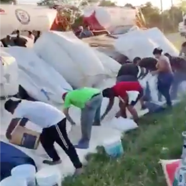 Un accidente ocurrido en la carretera Villahermosa-Cárdenas, a la altura de Cucuyulapa, derivó en un nuevo episodio de rapiña que fue captado en video y difundido ampliamente en redes sociales. En las imágenes se observa cómo varias personas sustraen bultos de azúcar de un tráiler volcado, mientras una mujer, identificada como doctora, confronta a los involucrados y les recuerda que la mercancía tiene propietario.