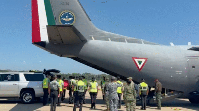 La llegada se realizó a bordo de una aeronave C-27J Spartan de la Fuerza Aérea Mexicana, bajo un fuerte dispositivo de seguridad. Los féretros, cubiertos con la bandera nacional, fueron recibidos con honores por integrantes de la Guardia Nacional, el Ejército Mexicano y la Fuerza Aérea.
