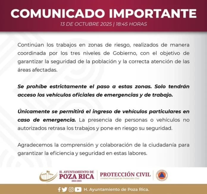 El Ayuntamiento de Poza Rica desató una ola de críticas al anunciar la prohibición de acceso a las zonas afectadas por las inundaciones, argumentando motivos de seguridad y limitando la entrada solo a vehículos oficiales. La decisión, impulsada por el alcalde Fernando “El Pulpo” Remes Garza, fue rechazada por la población, que asegura que las restricciones impiden el paso de personas y voluntarios que entregan víveres y ropa a las familias damnificadas.