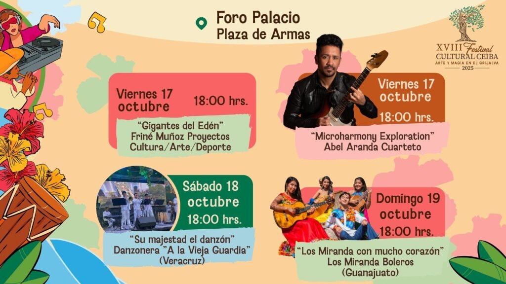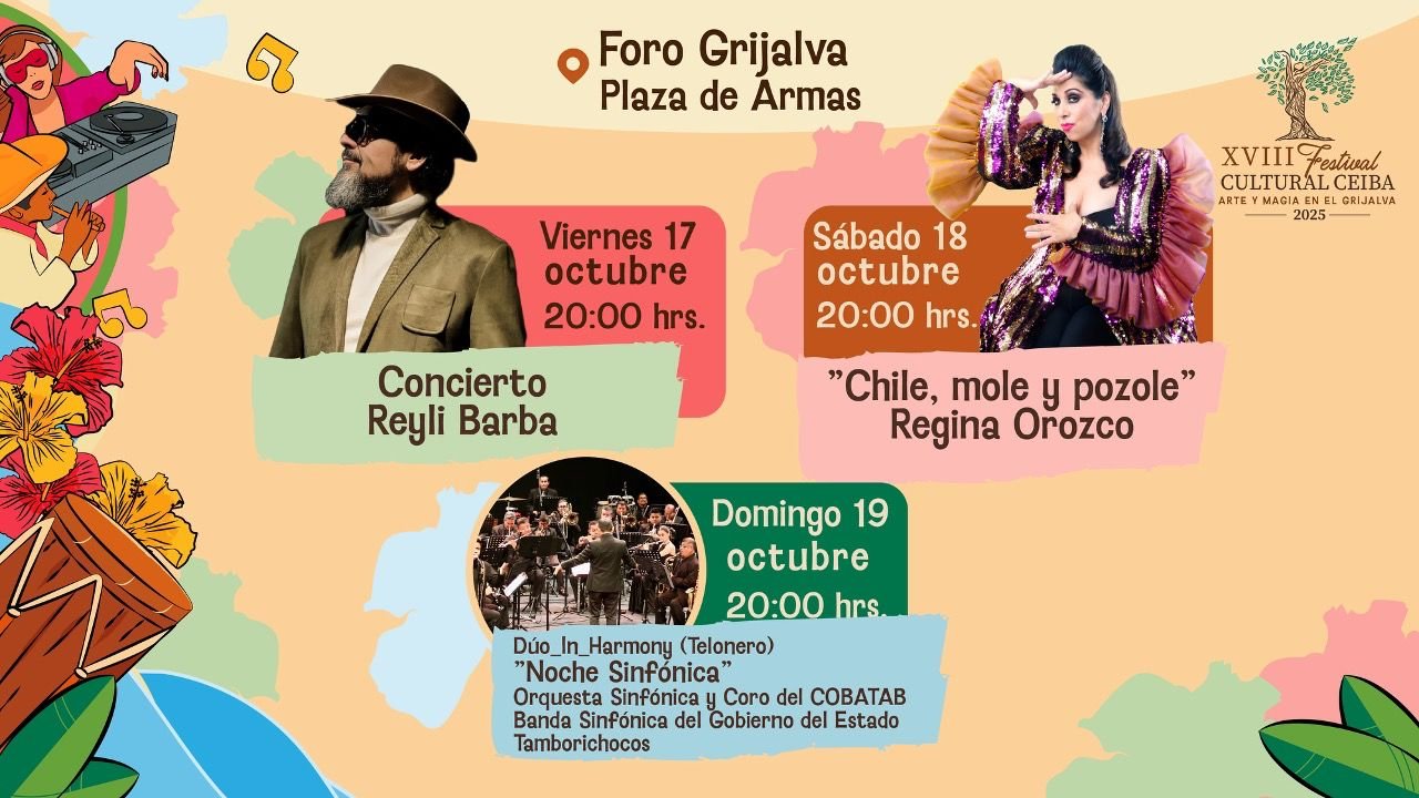 Hoy comienza el XVIII Festival Cultural Ceiba que, del 17 al 19 de octubre en Villahermosa, traerá grandes muestras dirigidas para toda la familia. Esta noche se presentará el talento del cantautor Reyli Barba para conquistar a las familias tabasqueñas. 20:00 hrs. en el Foro Grijalva de Plaza de Armas dzme un titulo