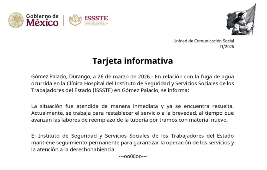 Posteriormente, el ISSSTE confirmó lo ocurrido mediante una tarjeta informativa, en la que explicó que la causa principal fue una falla en una tubería del sistema sanitario. La institución aseguró que la situación fue atendida de manera inmediata por el personal correspondiente, logrando controlar y resolver el problema en poco tiempo.