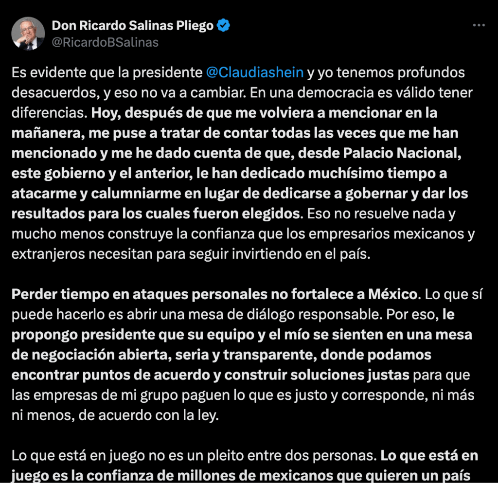 Ricardo Salinas Pliego, presidente de Grupo Salinas, propuso a la presidenta Claudia Sheinbaum crear una “mesa de diálogo responsable” para acordar el pago justo de impuestos de sus empresas. Reprochó que su gobierno y el anterior han invertido tiempo en atacarlo y calumniarlo, en lugar de fortalecer la confianza empresarial, afectando la inversión, el empleo y la estabilidad económica en México. Salinas enfatizó que el conflicto no es personal, sino sobre la confianza de millones de mexicanos en un país con reglas claras. Además, advirtió que Grupo Salinas podría emprender acciones legales por difamación y daño moral en México y Estados Unidos para defender su reputación.