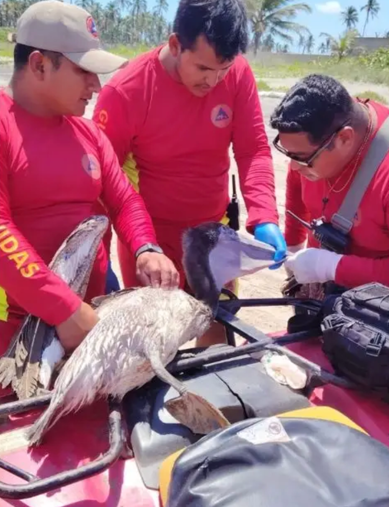 Un pelícano en condiciones críticas fue rescatado por personal del IPCET CEREPAEC Costa durante un recorrido preventivo en cuatrimoto, a un kilómetro de Playa del Sol, en el municipio de Paraíso, Tabasco. El ave se encontraba débil y desorientada, lo que alertó a los brigadistas.