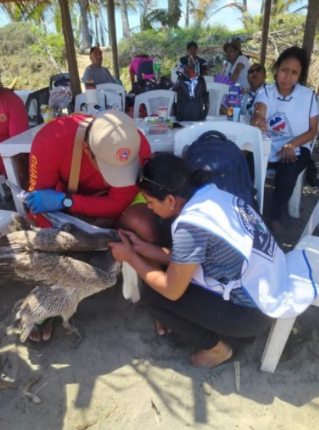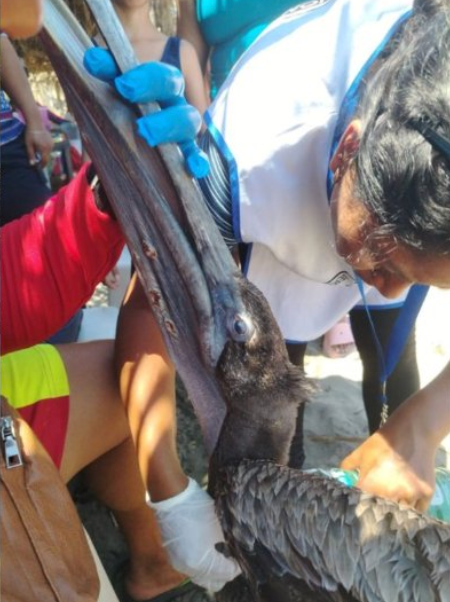 Tras una revisión inicial, se detectó que tenía la garganta obstruida por espinas de pescado, situación que le impedía alimentarse y ponía en riesgo su vida. De inmediato, el equipo de emergencia procedió a retirar las obstrucciones, además de realizar limpieza de heridas e hidratación para estabilizar al ejemplar.