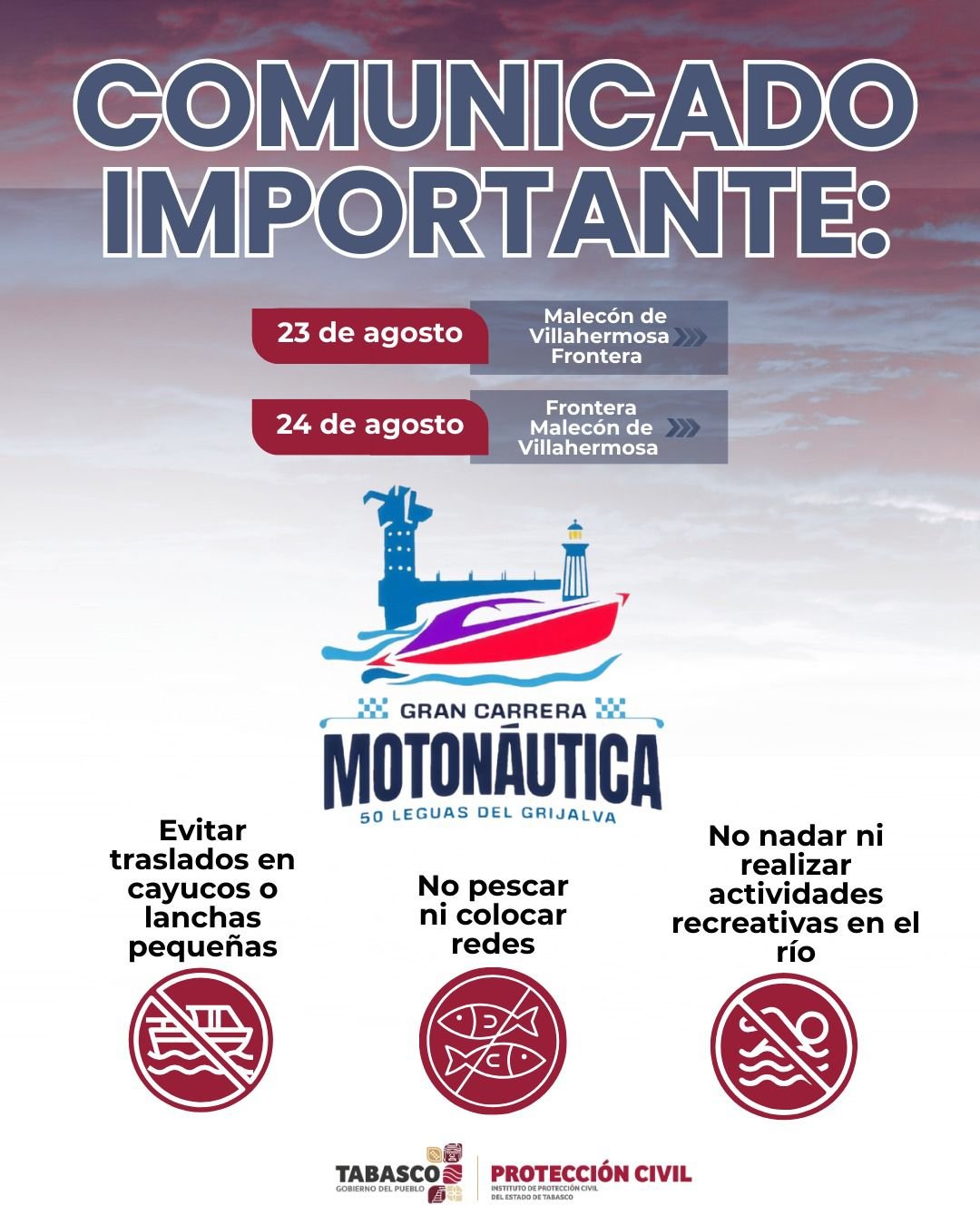 Con motivo de la Gran Carrera Motonáutica ’50 Leguas del Grijalva’ el Instituto de Protección Civil del Estado y las autoridades organizadoras exhortan a las familias y visitantes, a que tomen precauciones en las riberas del río, para evitar algún accidente. Tanto en la ciudad de Villahermosa como en Frontera se destinarán espacios para que el público en general pueda disfrutar de este evento deportivo. En el caso de las actividades dentro del río, estarán suspendidas durante el sábado y domingo en que se realice esta actividad.