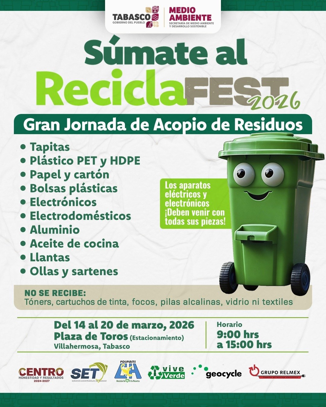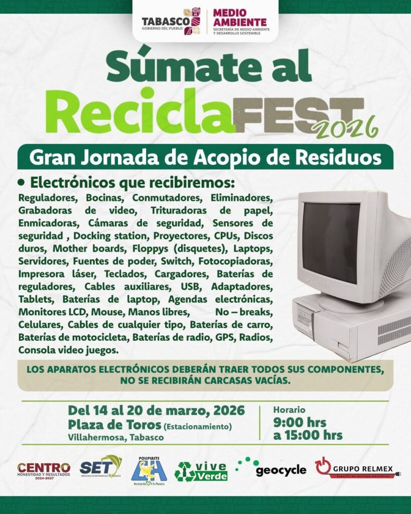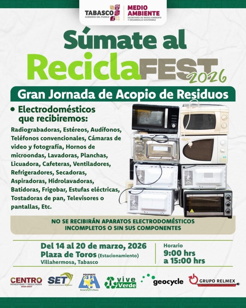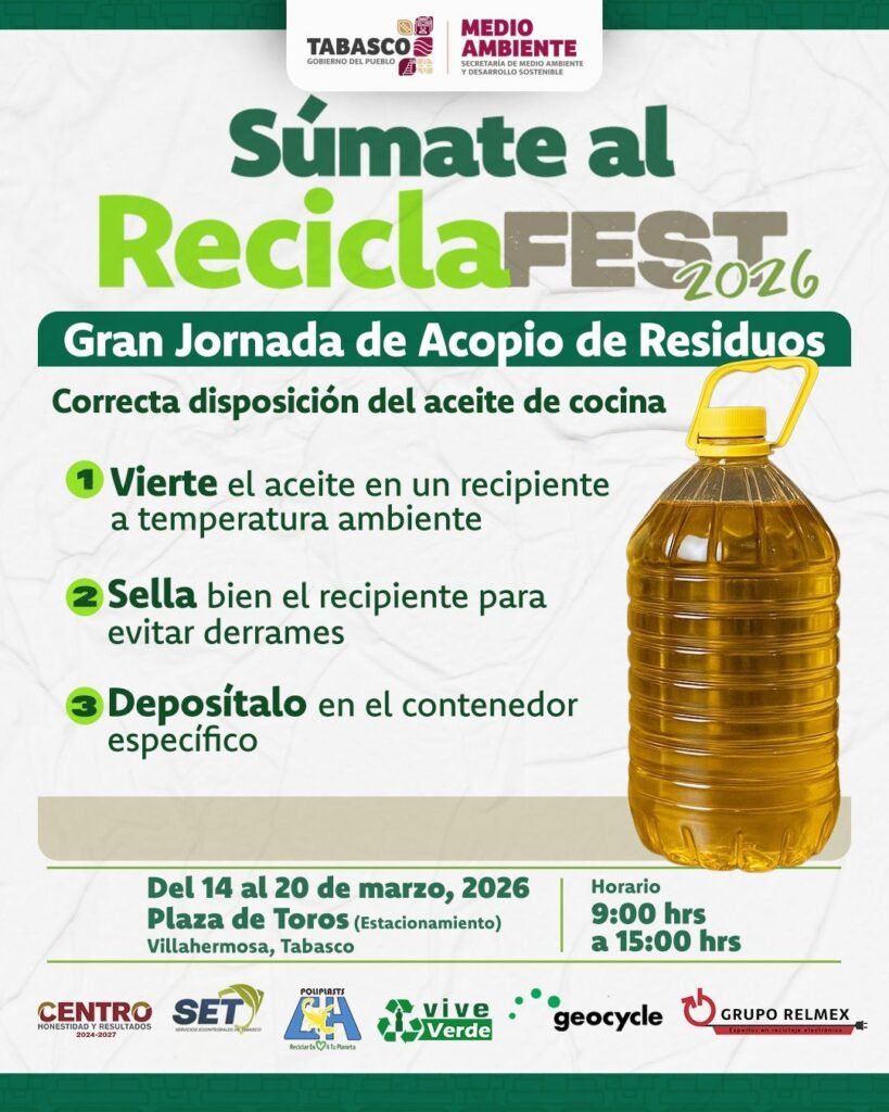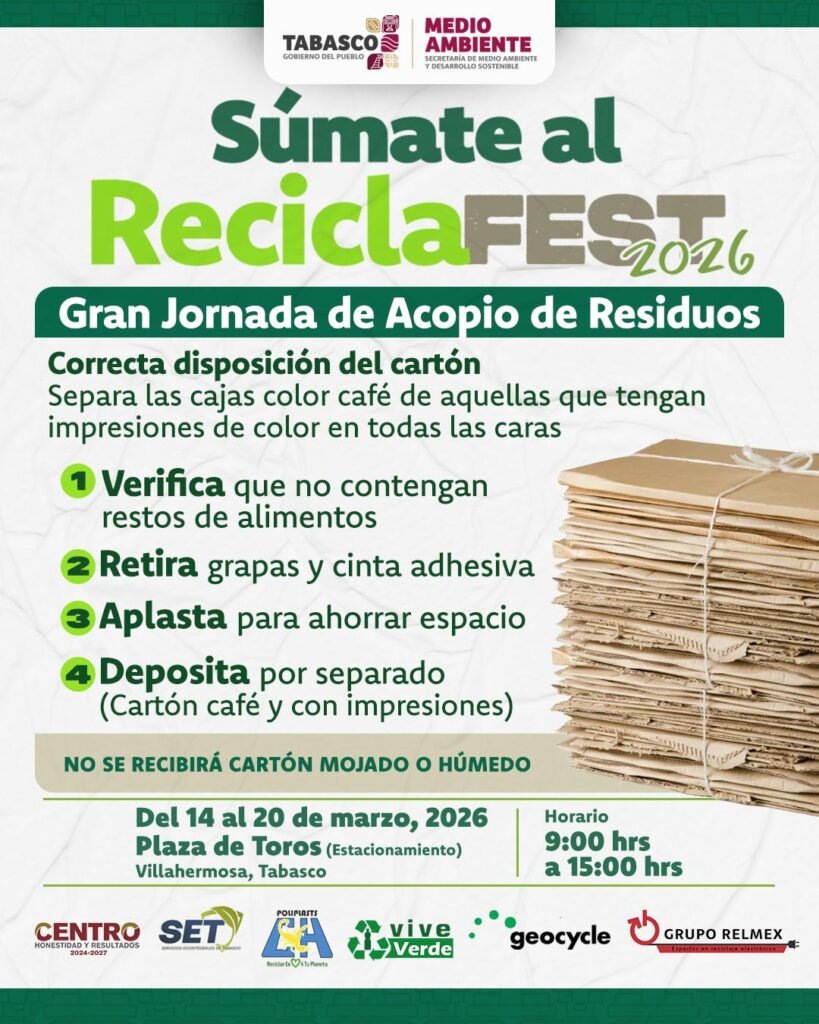 El Gobierno de Tabasco, a través de la Secretaría de Medio Ambiente y Desarrollo Sostenible de Tabasco, pondrá en marcha del 14 al 20 de marzo la campaña Recicla Fest 2026, una iniciativa orientada a fomentar la cultura del reciclaje y fortalecer la conciencia ambiental entre la población.
