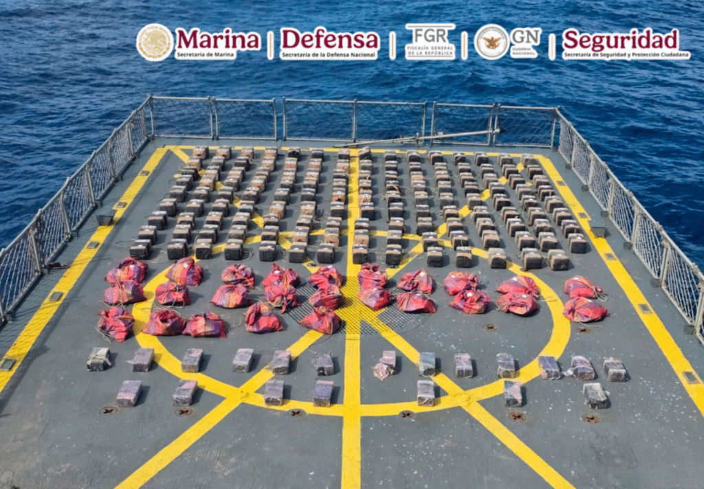 La Secretaría de Marina interceptó un semisumergible que transportaba 179 bultos de cocaína en aguas del Pacífico mexicano, a más de 250 millas náuticas al suroeste del Puerto de Manzanillo. Durante el operativo fueron detenidos tres tripulantes que viajaban en la embarcación de bajo perfil.