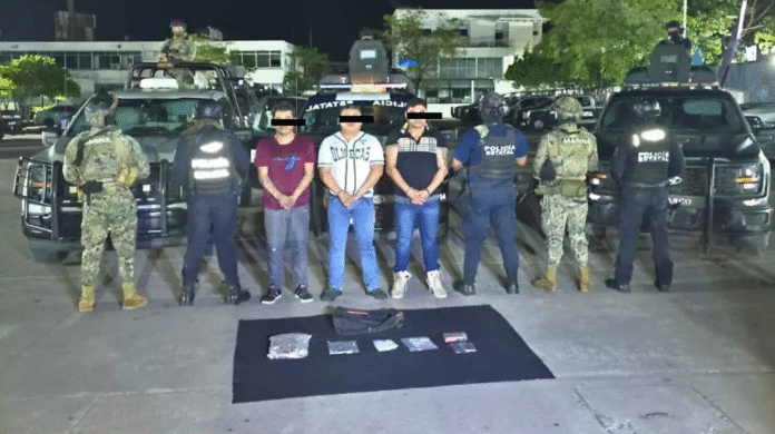 Los detenidos son Carlos Manuel “N” (alias “El Quesito”), Isaac “N” (alias “El Chelo”) y César Antonio “N” (alias “El Gordo”), todos mayores de 35 años. Durante el operativo de vigilancia, se les aseguraron bolsitas con presunta marihuana, envoltorios con sustancia similar a la cocaína y otros con metanfetamina (cristal). También se incautó una mariconera negra. Los tres sujetos y las drogas fueron inmediatamente puestos a disposición de la Autoridad Competente para el debido proceso de investigación.