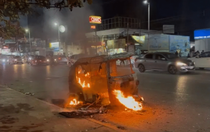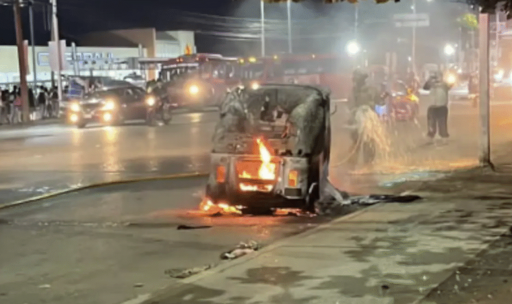Un acto violento se registró la noche de este martes en Villahermosa, luego de que un pochimóvil fuera incendiado sobre la avenida Ramón Mendoza, frente a Plaza Las Américas. De acuerdo con versiones preliminares y videos difundidos en redes sociales, dos individuos que viajaban en una motocicleta prendieron fuego a la unidad y posteriormente intentaron huir.