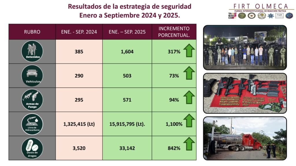 El gobernador Javier May Rodríguez afirmó que en Tabasco no se encubre a nadie y se mantiene una política de cero impunidad. De enero a septiembre de 2025, las detenciones aumentaron 317%, el combate al robo de hidrocarburos creció 1,100%, los decomisos de drogas 842% y las armas aseguradas 94%. La coordinación entre la Policía Estatal, la FGE y la FGR ha permitido desarticular células delictivas, recuperar millones de litros de combustible robado y detener a 79 generadores de violencia. May subrayó que la meta es lograr una paz duradera basada en justicia, legalidad y prevención.