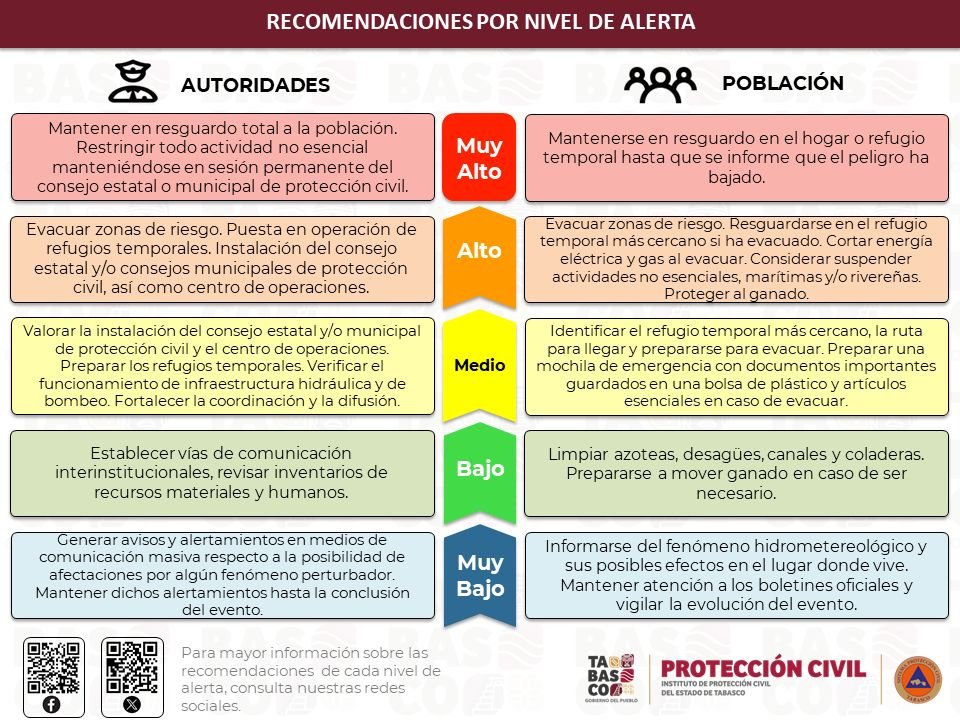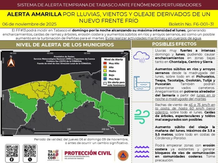 El Instituto de Protección Civil del Estado de Tabasco activó la alerta amarilla ante la llegada del Frente Frío No. 13, que impactará desde el domingo por la noche y alcanzará su mayor intensidad el lunes. Se esperan lluvias muy fuertes, vientos de hasta 75 km/h en la costa y oleaje entre 3.5 y 5.5 metros, principalmente en Cárdenas y Paraíso. Las precipitaciones podrían provocar encharcamientos, caída de árboles, erosión costera y aumentos súbitos en ríos y arroyos serranos. El Gobierno del Estado mantiene coordinación con autoridades federales y municipales para atender emergencias. Se recomienda evitar actividades marítimas, asegurar objetos y estructuras ligeras, y extremar precauciones al transitar por carreteras. Protección Civil exhorta a la población a mantenerse informada por medios oficiales y evitar la difusión de rumores para garantizar la seguridad de todas las familias tabasqueñas.