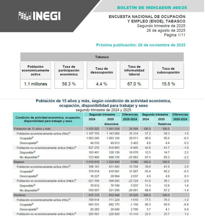 El segundo trimestre de 2025 colocó a Tabasco como el estado con mayor desempleo en México, según la Encuesta Nacional de Ocupación y Empleo (ENOE) del INEGI. La entidad reportó una tasa de desocupación del 4.4%, con 49 mil 913 personas sin empleo de un total de un millón 143 mil 069 económicamente activas. Villahermosa registró 232 mil 703 ocupados y 9 mil 18 desocupados, equivalente a 3.7% de desempleo. El informe también reveló que el 67% de los trabajadores en Tabasco se encuentran en empleos informales, lo que refleja la vulnerabilidad laboral de la población. Estas cifras ubican a la entidad por encima de otros estados con altos índices de desocupación, como Ciudad de México y Coahuila, resaltando la urgencia de políticas que fomenten empleo formal y seguro para sus ciudadanos.
