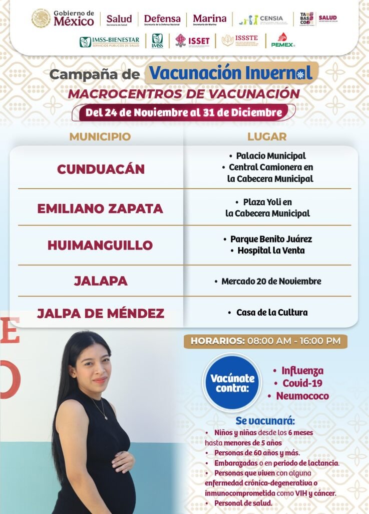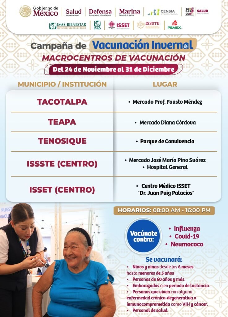 Estos centros estarán distribuidos en los 17 municipios del estado, ubicándose en lugares estratégicos como parques, mercados y centros de salud para un fácil acceso. Se aplicarán vacunas contra influenza, covid-19 y neumococo, con prioridad en niños menores de 5 años, adultos mayores, embarazadas y personas con enfermedades crónicas como diabetes e hipertensión. Hasta la fecha, el estado registra 18 casos confirmados de influenza y dos defunciones, ambas personas no vacunadas. Por ello, se exhorta a la población a acudir a vacunarse para reducir riesgos y proteger su salud durante la temporada invernal 2025-2026.
