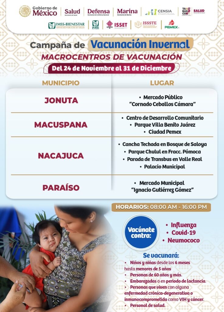 Para hacer frente a las enfermedades respiratorias de temporada, la Secretaría de Salud de Tabasco ha dispuesto la apertura de 28 macrocentros de vacunación entre el 24 de noviembre y el 31 de diciembre.