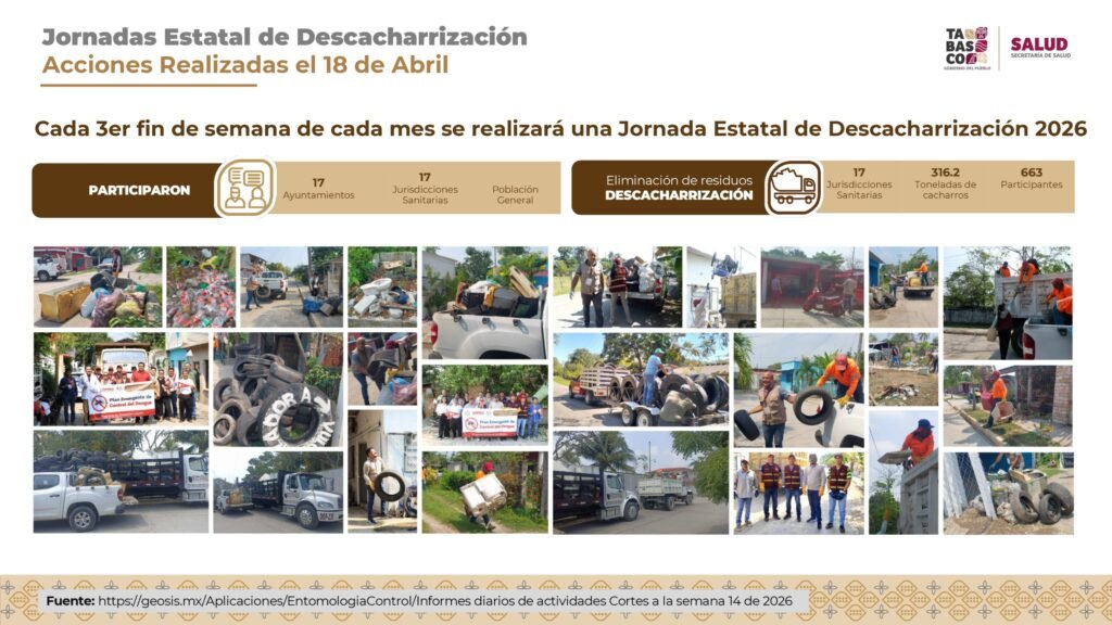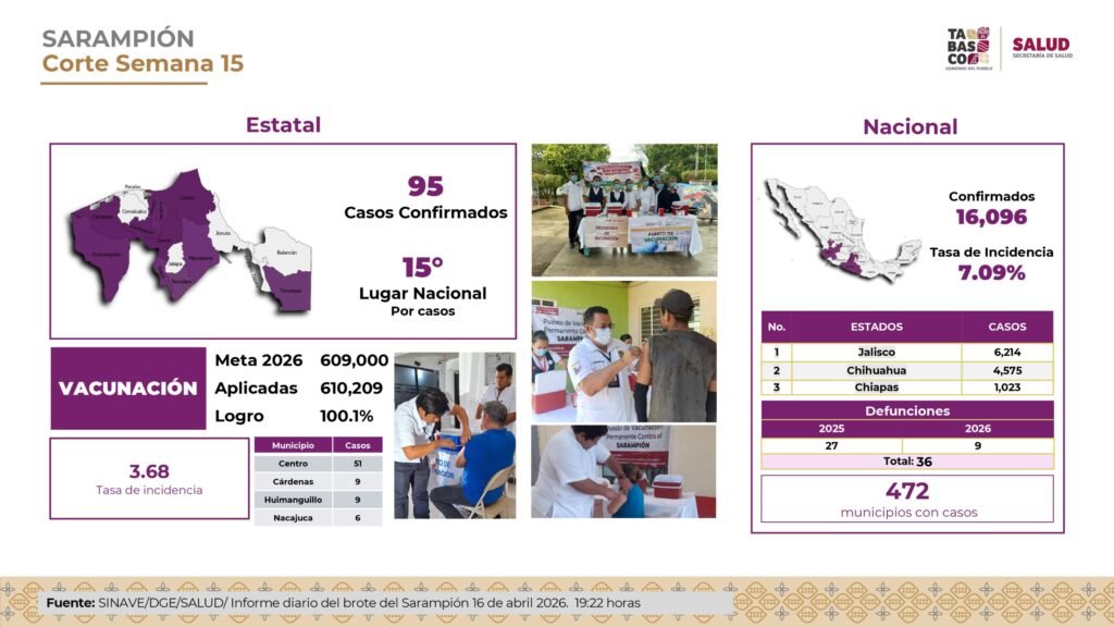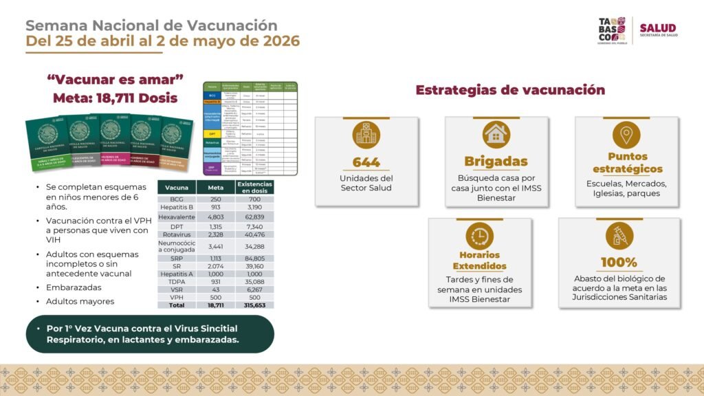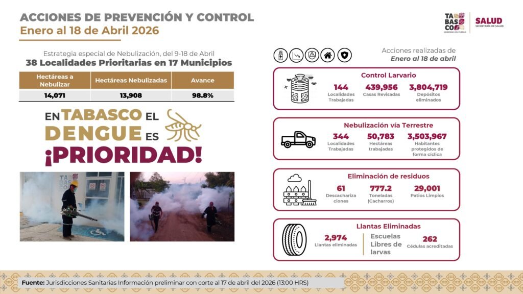 El Gobierno de Tabasco reportó resultados favorables en materia de salud pública al confirmar que no se han registrado nuevos casos de sarampión y que el dengue se mantiene bajo control, gracias a una estrategia preventiva integral. El secretario de Salud, Alejandro Calderón Alipi, informó que se superó la meta de 609 mil vacunas aplicadas, consolidando a la inmunización como una herramienta clave contra brotes epidemiológicos. En paralelo, se han intensificado acciones contra el dengue, con la nebulización de más de 51 mil hectáreas en 344 localidades y la eliminación de 777 toneladas de cacharros, reduciendo criaderos del mosquito.
