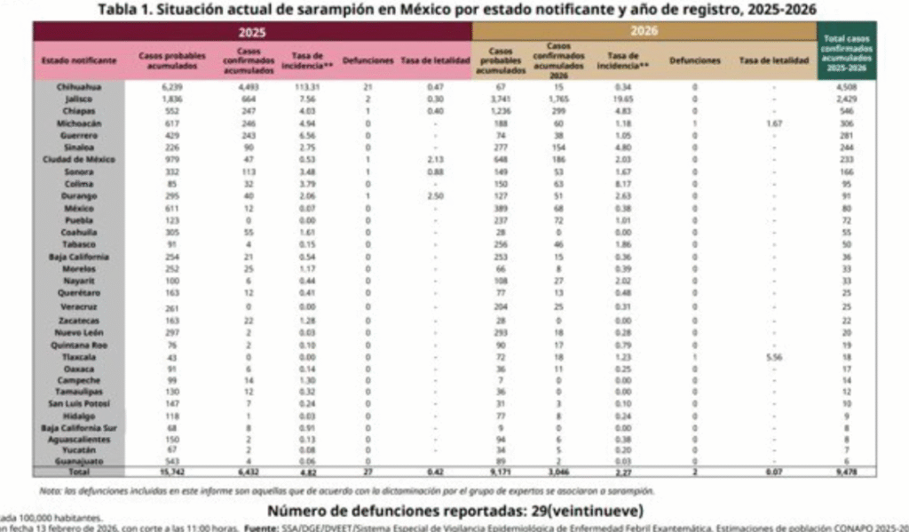 A nivel nacional, México suma 9 mil 478 casos confirmados de sarampión entre 2025 y 2026, con un total de 29 defunciones, de las cuales dos se han registrado durante el presente año, según datos oficiales.