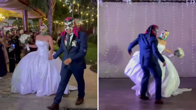 Una pareja mexicana decidió romper con las tradiciones y transformar su boda en un espectáculo de lucha libre que conquistó internet. En lugar del clásico primer baile, los novios hicieron su entrada al estilo luchador profesional: él portando la máscara de Penta El Zero Miedo y ella la de La Hiedra, con música de John Cena de fondo. En el centro del salón recrearon llaves, movimientos y dramatismo propios del cuadrilátero, provocando risas, aplausos y ovaciones entre familiares y amigos. El video compartido en TikTok superó rápidamente las cien mil reproducciones, con comentarios que elogian su creatividad: “La boda perfecta sí existe”, “0 miedo al matrimonio”. Esta celebración no solo reflejó el amor y complicidad de la pareja, sino también cómo la lucha libre, como parte esencial de la cultura mexicana, puede fusionarse con momentos íntimos y dar lugar a recuerdos inolvidables.