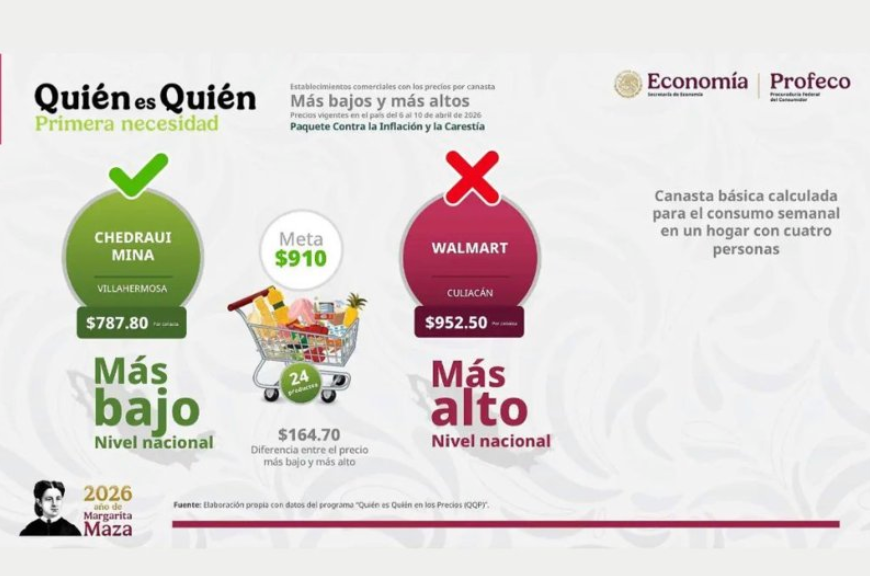 El reporte, titulado ‘Quién es quién de primera necesidad’, compara los precios en distintos establecimientos del país para identificar las opciones más baratas y más caras. En contraste, el precio más alto se registró en Culiacán, Sinaloa, donde la misma canasta alcanzó los 952.50 pesos.