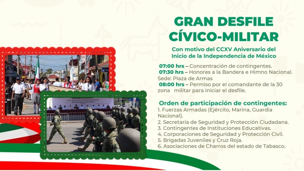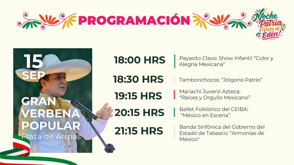 Tabasco se prepara para celebrar los 215 años del Grito de Independencia con el festival “¡Viva el Edén!”, un evento que reunirá más de 72 actividades en 11 sedes culturales durante septiembre. Habrá danza, música, talleres, exposiciones y gastronomía, incluyendo una cata de cacao en lengua de señas y un corredor de sabores tradicionales. La gran fiesta será el 15 de septiembre en Plaza de Armas: mariachi, tamborileros, ballet folclórico y el espectáculo de ‘El Mimoso’, tras el Grito encabezado por el Gobernador Javier May, seguido de fuegos artificiales. El 16 se vivirá el Desfile Cívico-Militar con escuelas, fuerzas armadas y estudiantes caracterizados como héroes de la independencia. Una celebración llena de orgullo, cultura y unidad para todas las familias tabasqueñas.