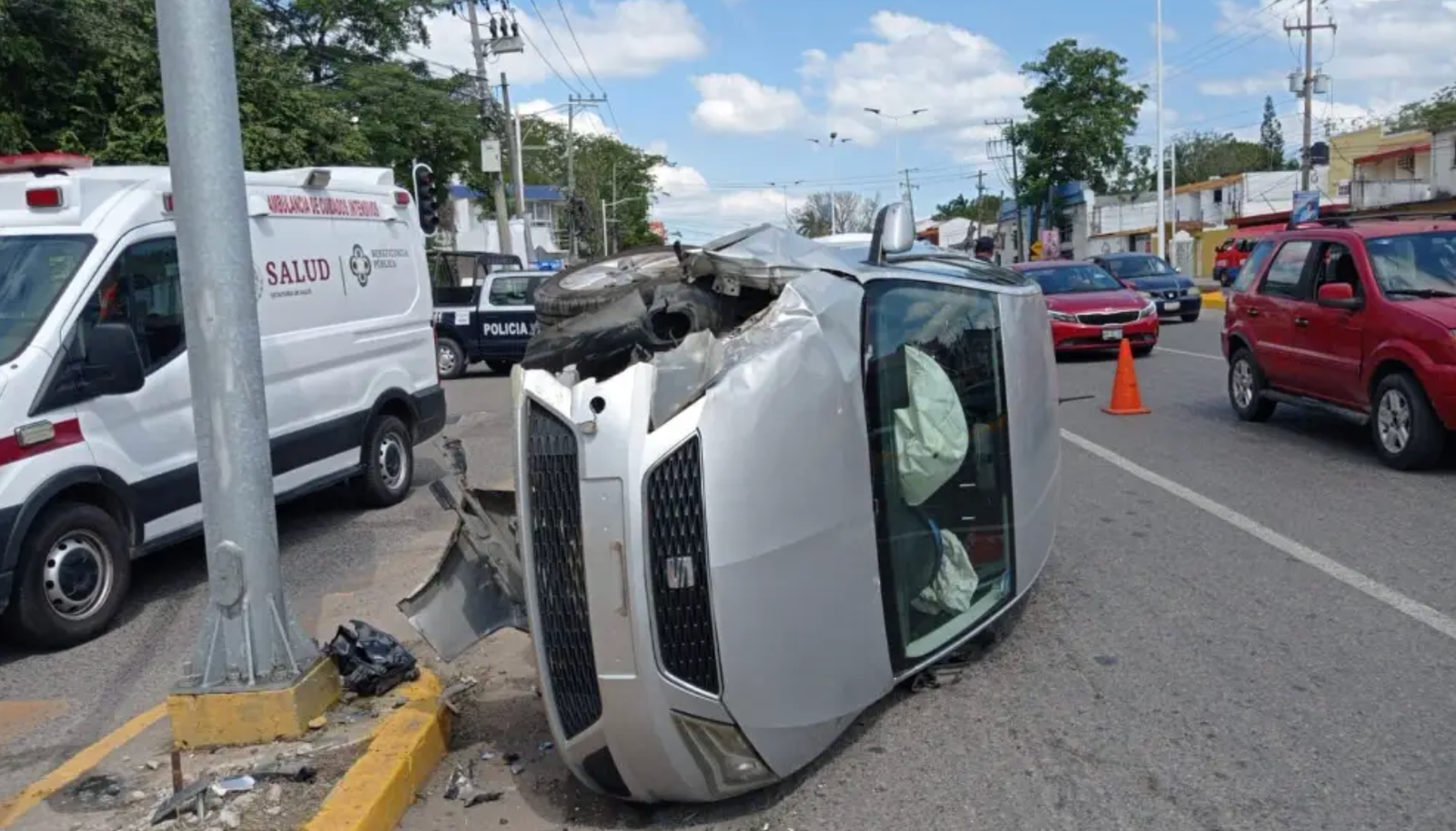 Un accidente vial se registró este domingo en Avenida Universidad, en el municipio de Centro, luego de que un vehículo tipo sedán, color gris, se impactara contra la base de un semáforo y terminara volcado. Los hechos ocurrieron alrededor del mediodía, frente a las instalaciones de la Universidad Juárez Autónoma de Tabasco (UJAT).